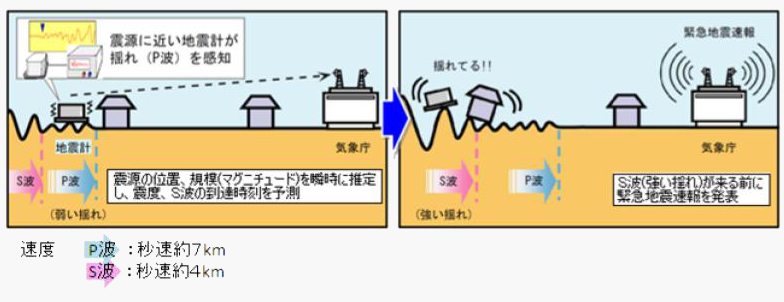 •地震波の伝わる速度の差を利用して、 先に伝わるP波を検知した段階でS波が伝わってくる前に危険が迫っていることを知らせる仕組み。