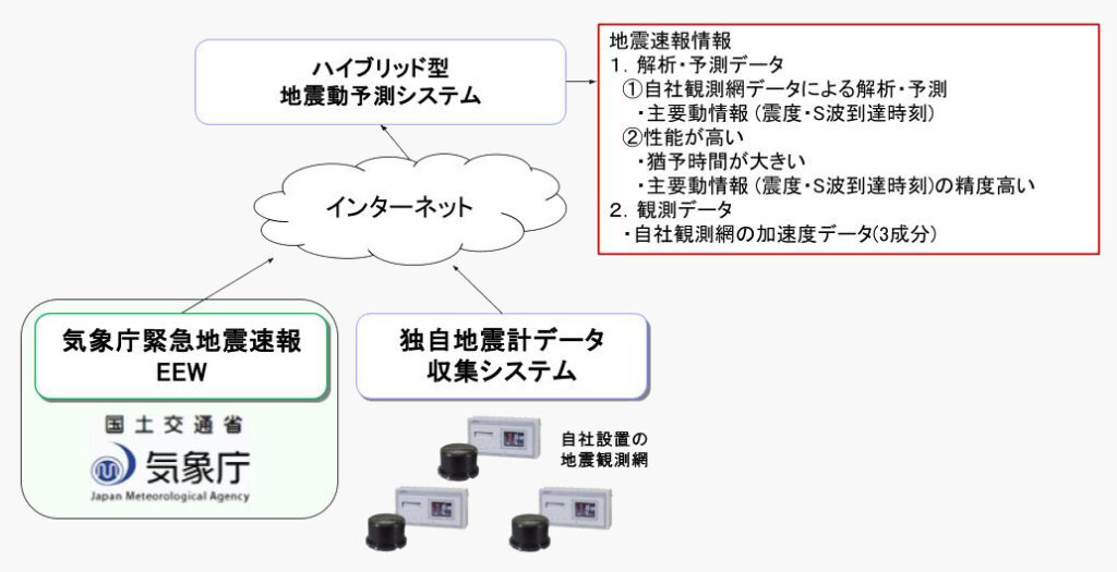 独自地震観測網による観測データと、 気象庁から 配信される緊急地震速報の両者を最大限に活用す るハイブリッド型地震動予測システムである。 特 に深刻な被害をもたらす直下地震に対しては密に 配置される自社地震観測網によるデータと気象庁 速報とのハイブリッド予測であるので猶予時間が 大きく、かつ予測精度も高いことが本システムの 最大の導入意義となる。